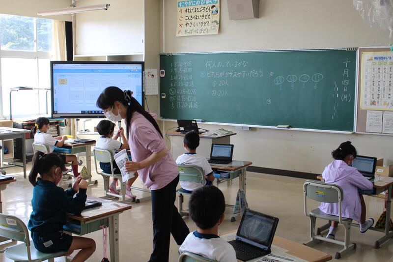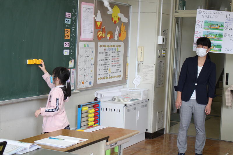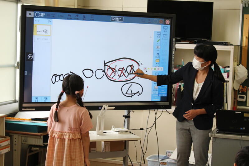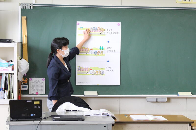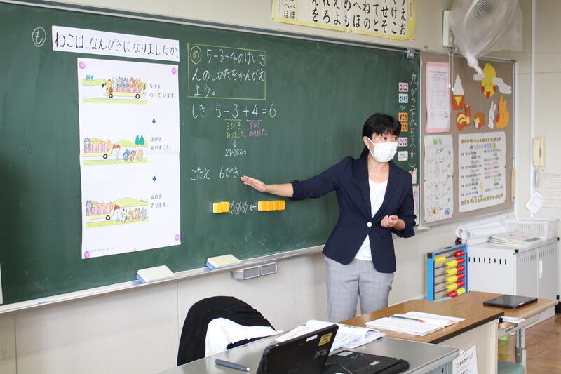 1年生は算数科「3つの数の計算」の授業でした。車にねこが乗ったり車から降りたりする場面から式をつくり、様々な方法で答えを求める学習です。