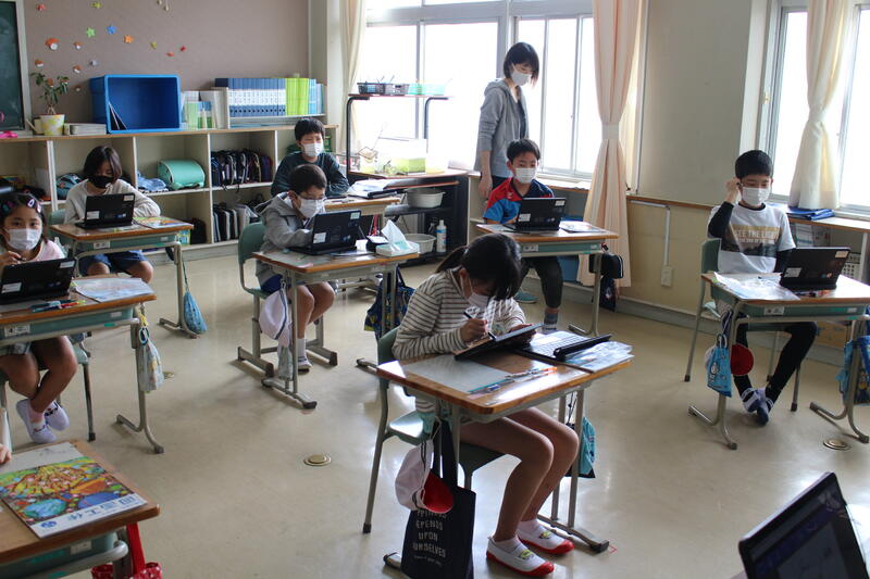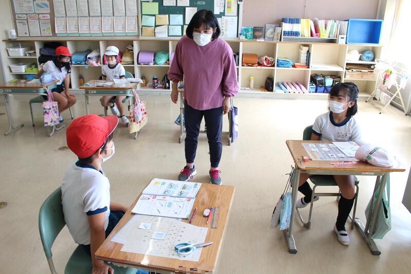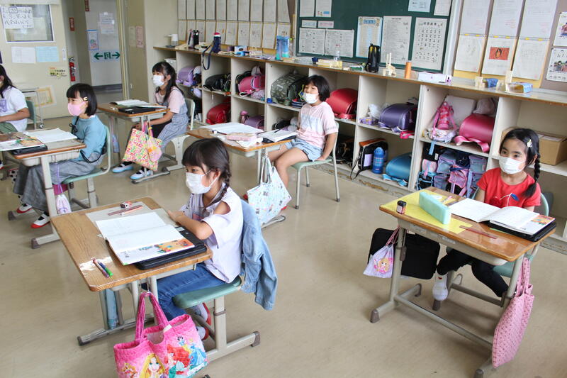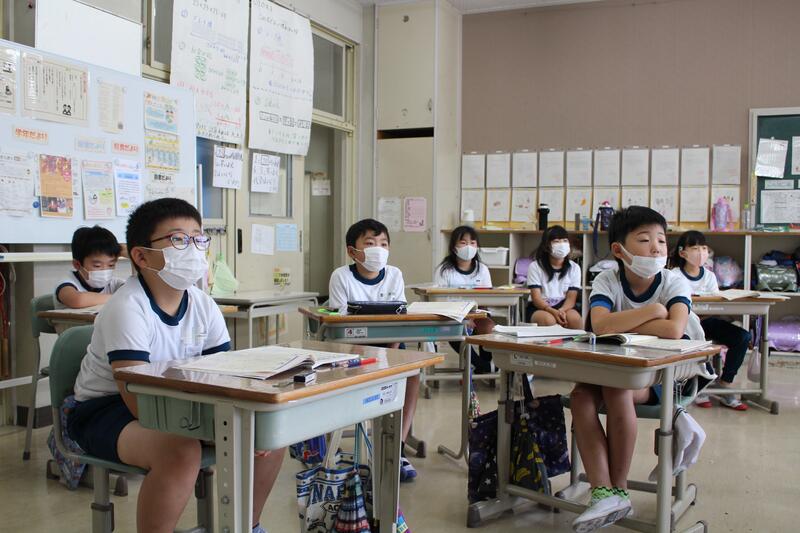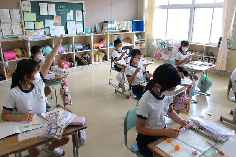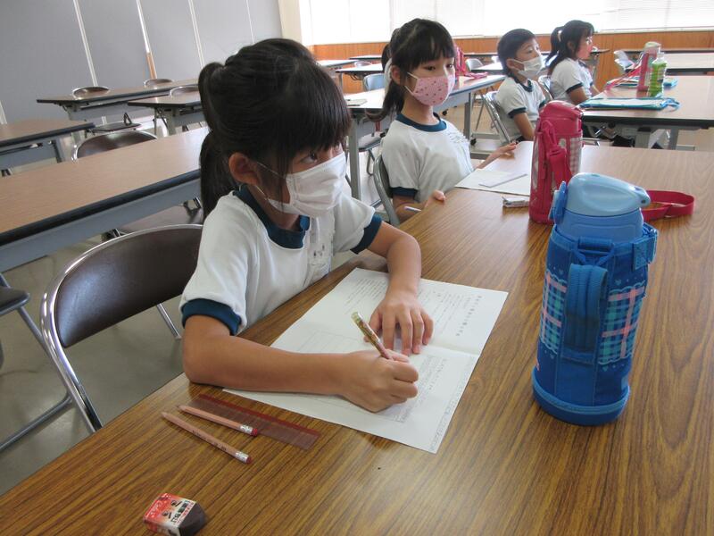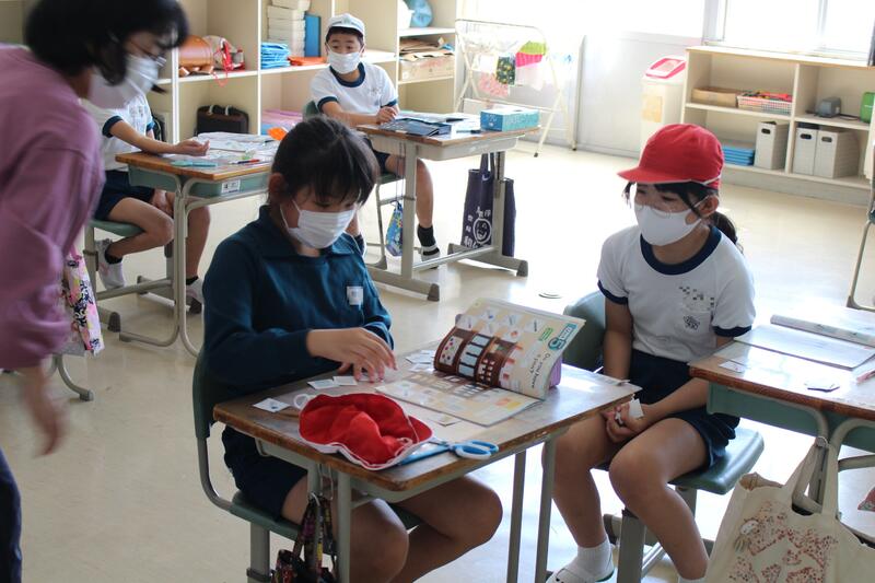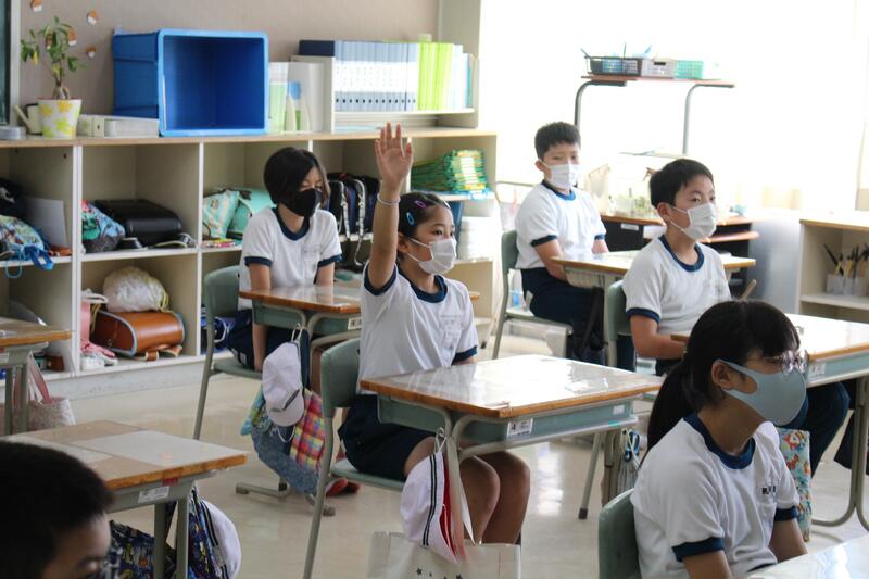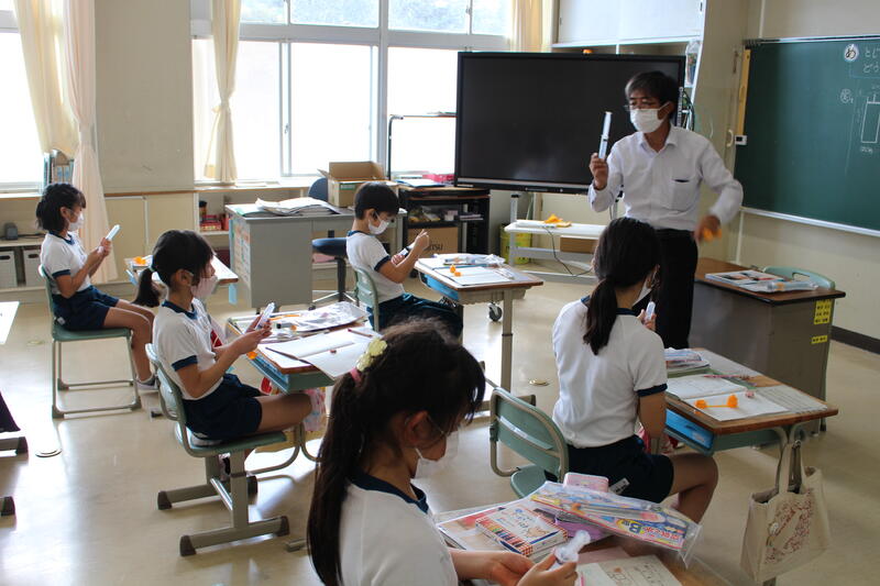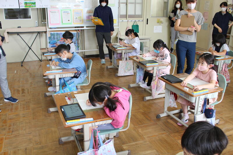 4年生は外国語活動のようです。「Do you have a ~?」「Yes,I do.」「No,I don't.」のセンテンスを使って英語で会話をしています。「ホッチキスって、何て言うんだっけ?」と困っている児童に先生が優しくヒントを。微笑ましくなる瞬間でした。