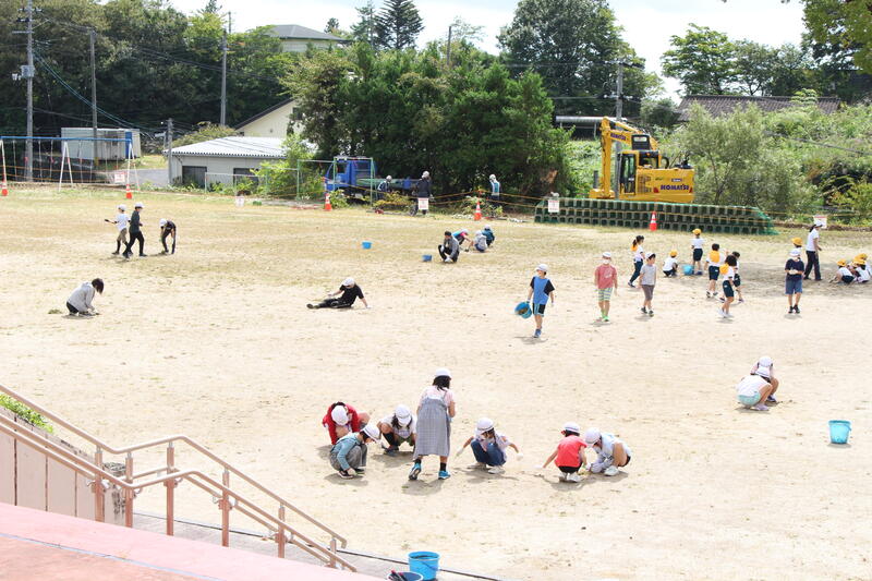 晴れた日の大休憩の校庭。自分たちの学習環境を整えるために、短時間ではありますが全校児童と全職員で除草作業に取り組んでいます。やはり「継続は力なり」です。徐々にきれいになってきました。