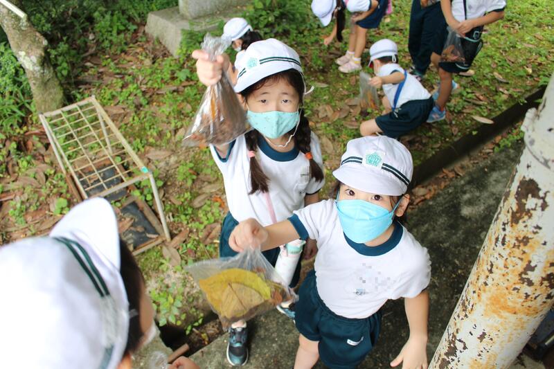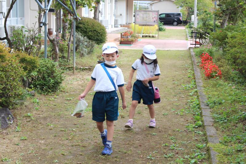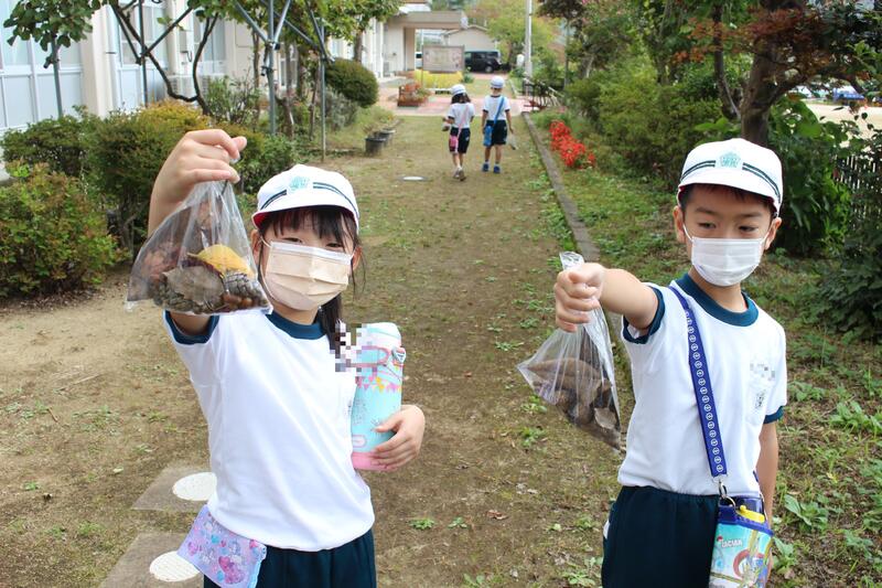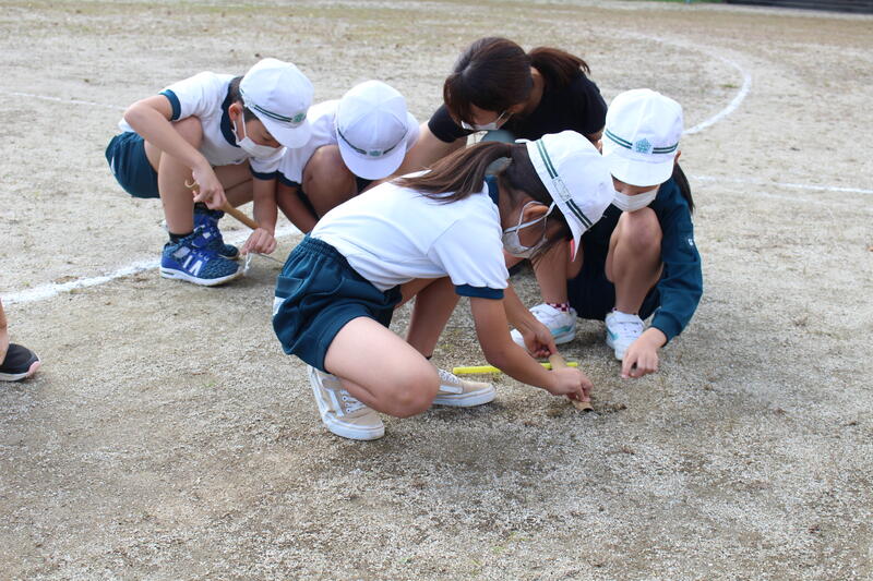 そんな晴れた校庭を歩き回っているのは、1年生です。どうやら秋を見つけて、それを使って何かを作るようです。さあ、何ができるかな?