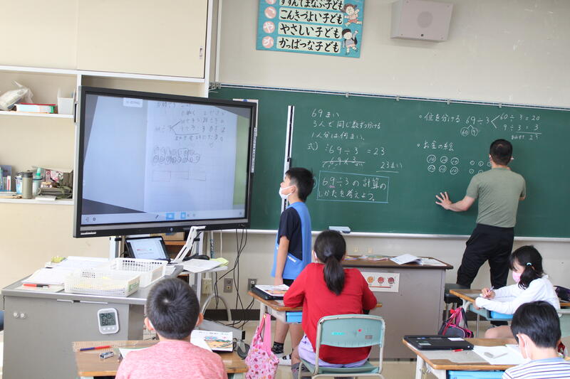 3年生は算数科の学習のようです。「60÷3ならできたけど、69÷3はどうやって?」と、みんなで考えています。自分の考え方を精一杯伝えようとする友だちに対して、真剣なまなざしでそれを受け止めようとする3年生。学習に取り組む姿勢も変わってきました。