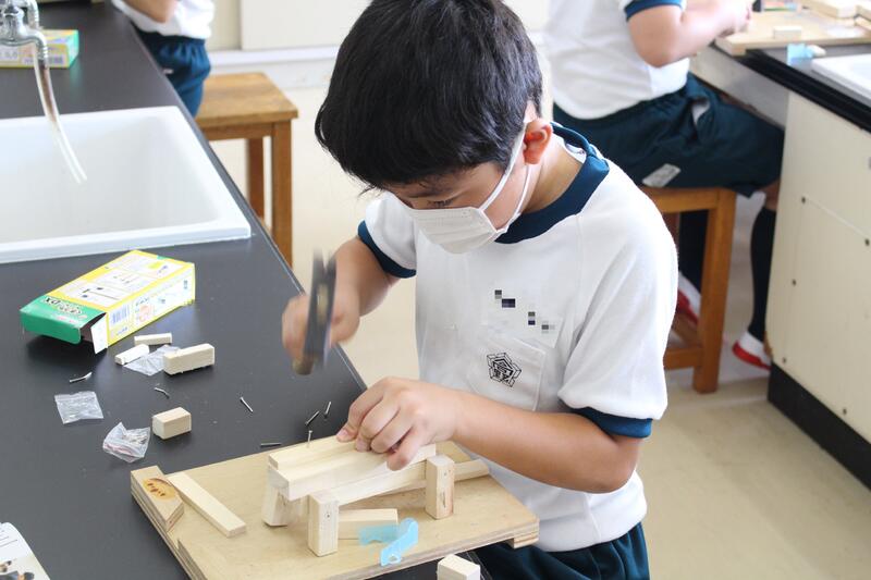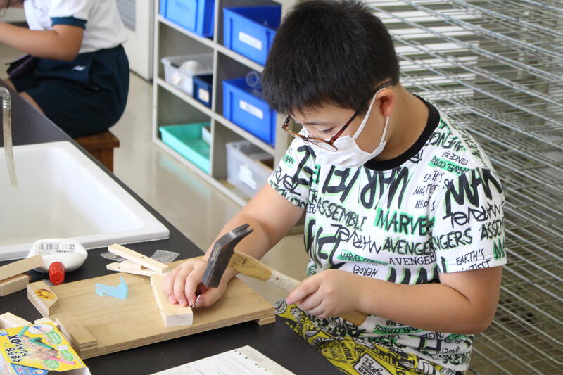 3階から「トン、トン、トン」というリズミカルな音が聞こえます。3年生が図画工作科の学習をしているようです。木片に釘を打ちながら発想を膨らませ、自分のイメージした者を制作しているようです。
