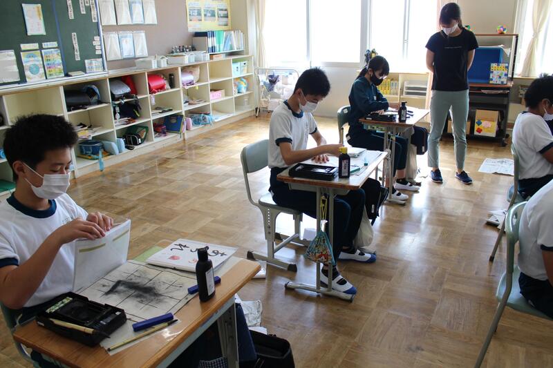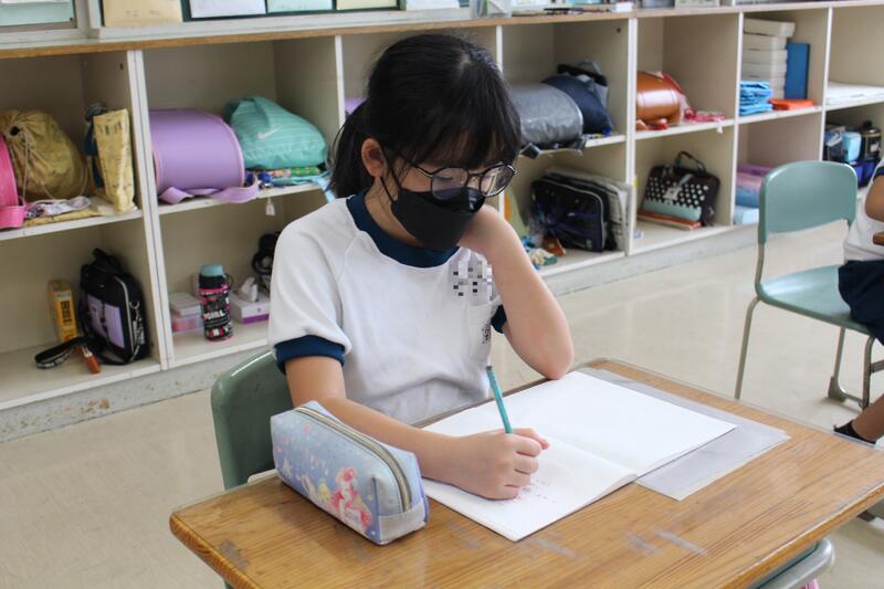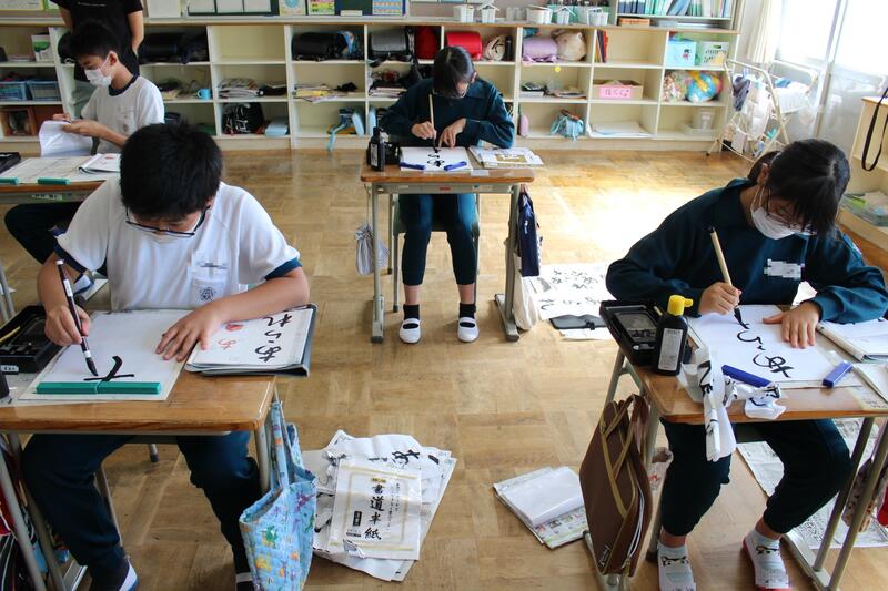 6年生は書写の学習のようです。平仮名の作品を練習しているようですね。漢字と違って平仮名は曲線が多いので、筆づかいが難しいようです。「ううん」と唸りながらも、真剣に練習に取り組んでいました。