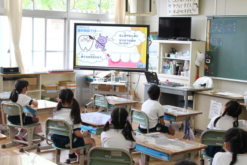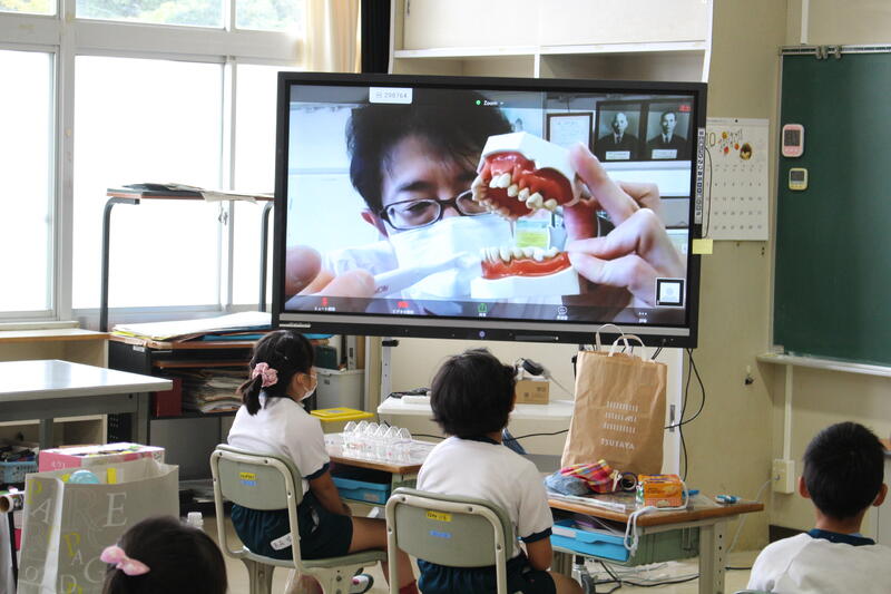 本日は、本校学校歯科医さんに来校いただき歯科検診を実施しました。それに先立ち、本校の健康課題のひとつである口腔衛生改善のために、学校歯科医さんからオンラインで歯科指導を行っていただきました。