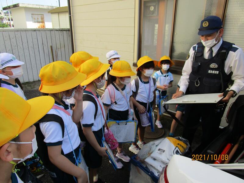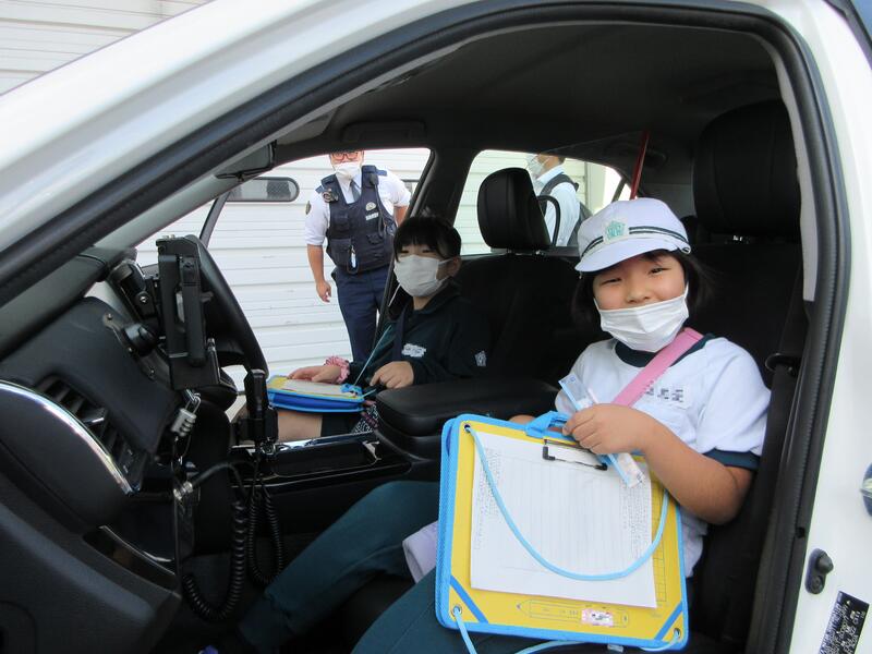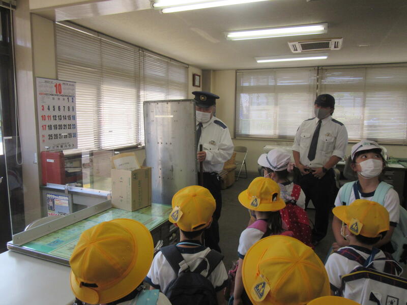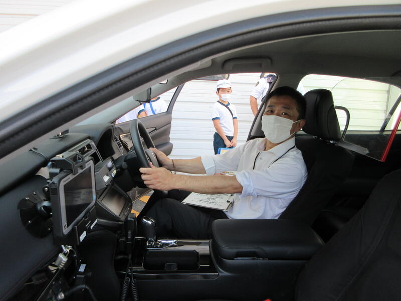 続いて、内郷交番に向かいました。内郷交番では、交番の中だけでなくパトカーの中も見せていただきました。初めて見る物ばかりで、子どもたちも興味津々でした。