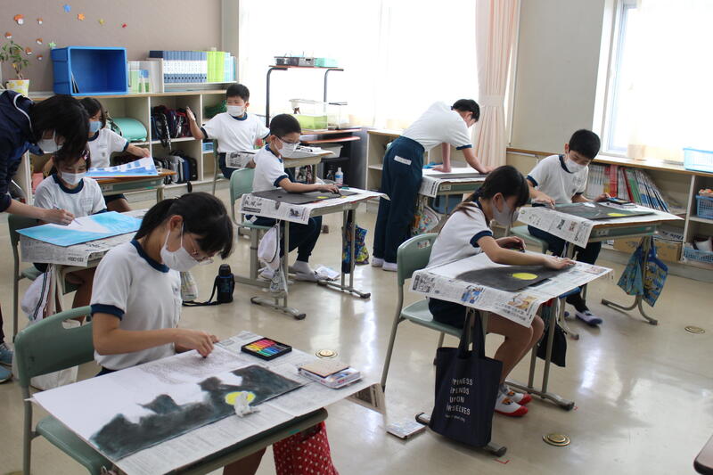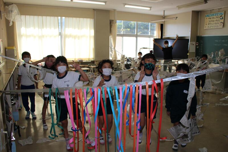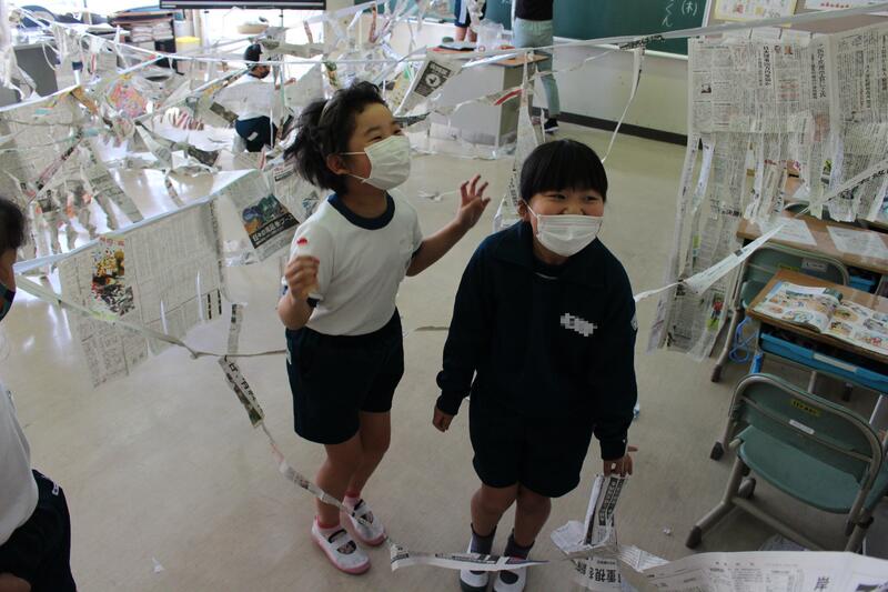 2年生は図画工作科。新聞紙を切ってつないで、自分たちの空間を創造。ようこそ、私たちの世界へ!