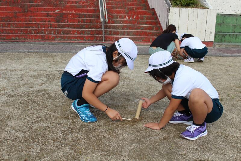 3年生は理科。日なたと日陰、地面の温度はどう違う?温度計にみんなで注目。