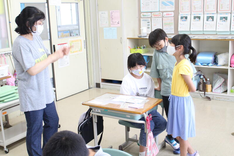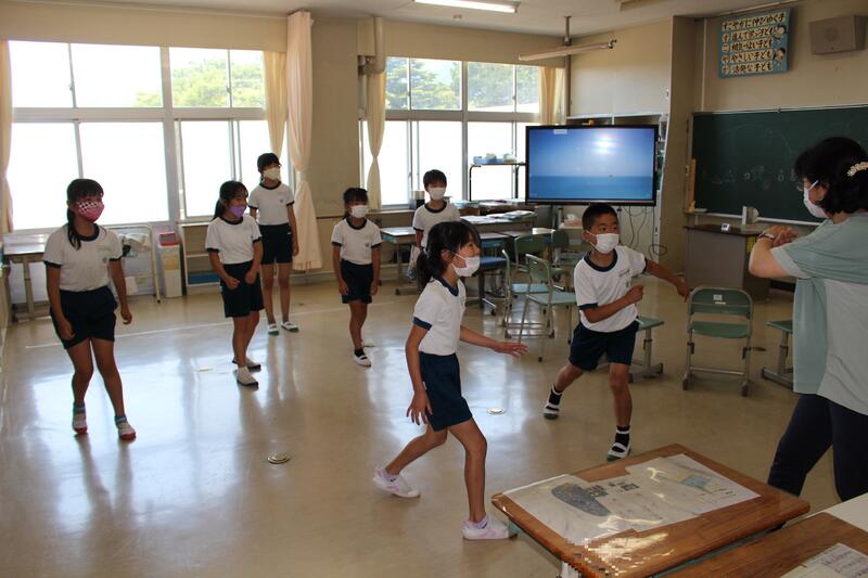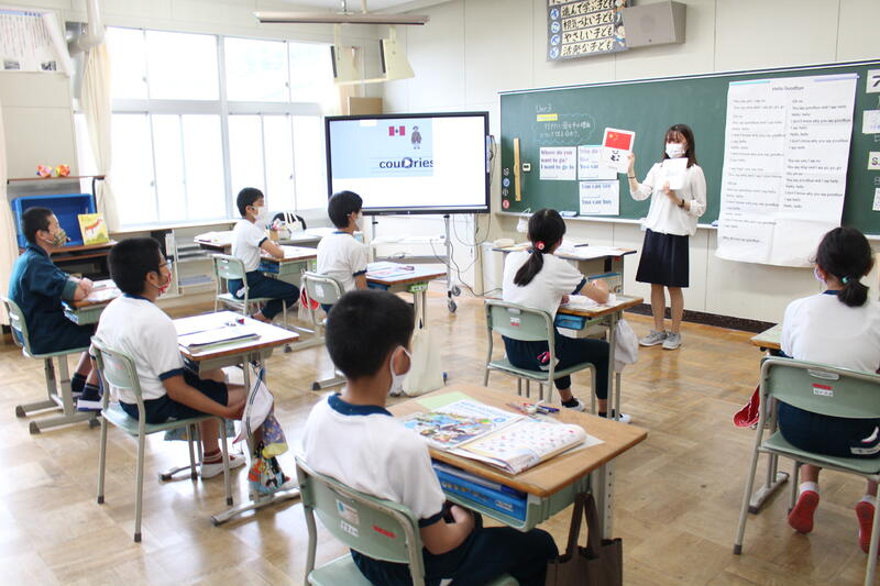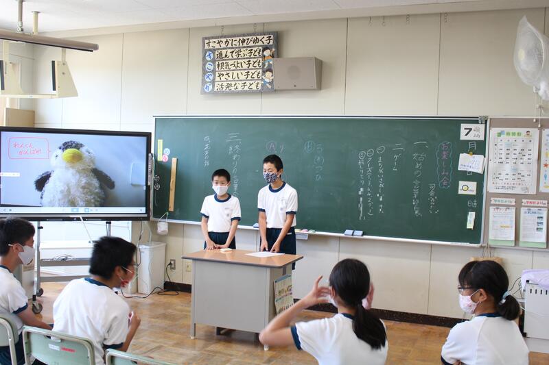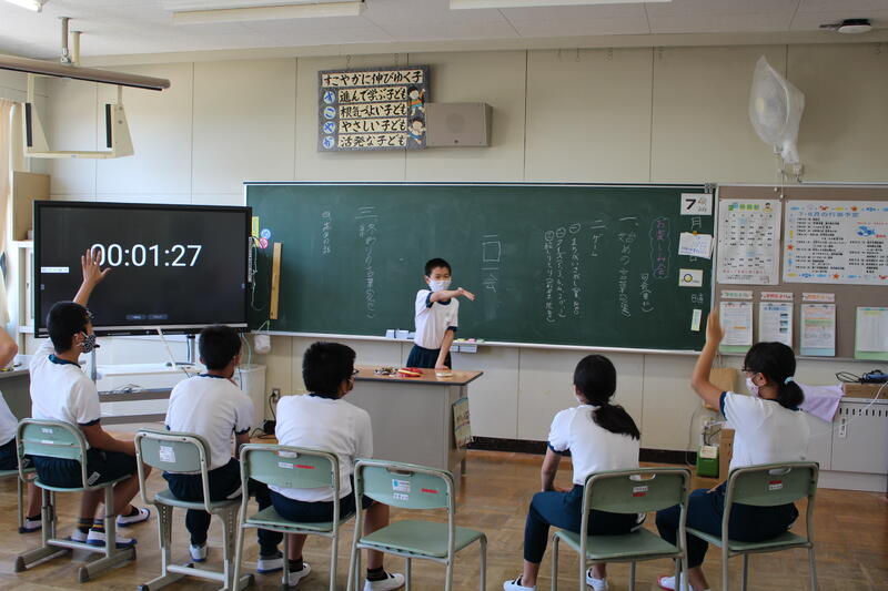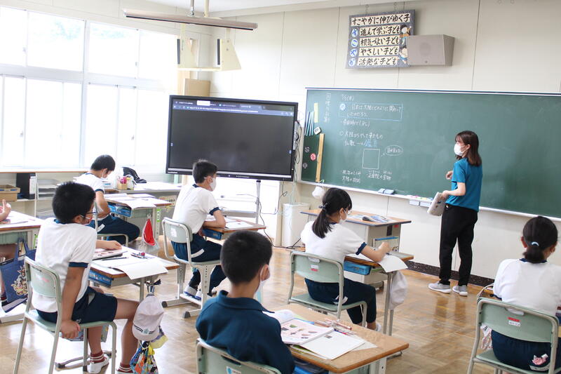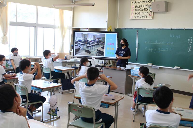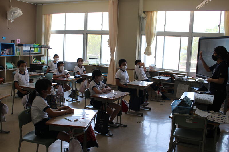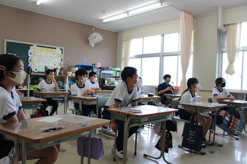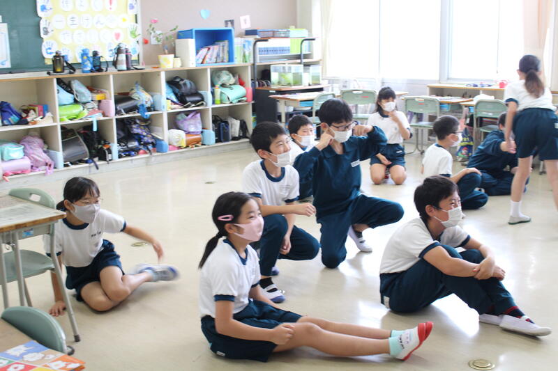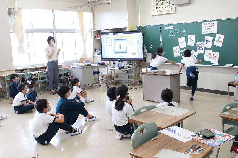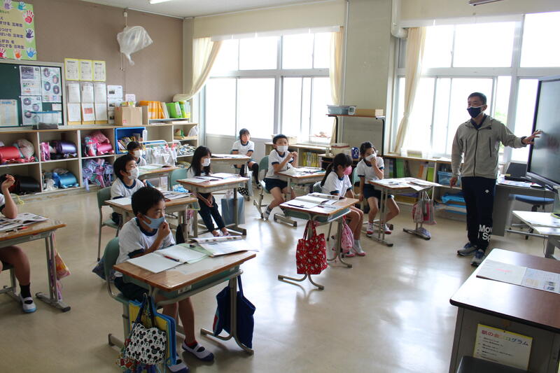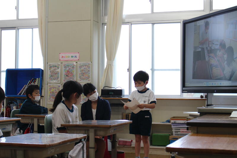 5年生はALTの先生との外国語科の学習です。どうやら日本とアメリカの学校の違いを聞いているようです。「アメリカでは、小学6年生が中学1年生となる」ということを聞き、「えー!」という驚きの声が上がっていました。