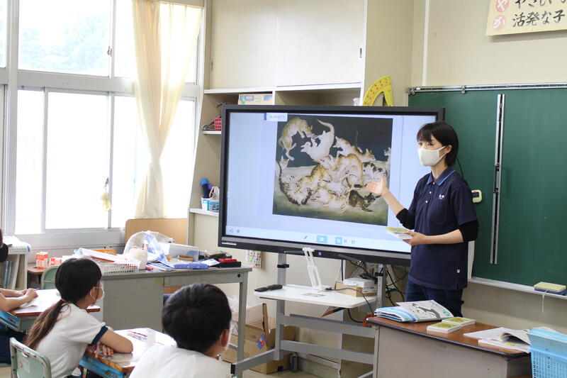 作品を鑑賞しながら、作品のタイトルを想像しているようです。子どもたち一人一人が違った視点から鑑賞してタイトルをつけるので、ユニークなものが次から次へと発表されます。教室内も大盛り上がりです。