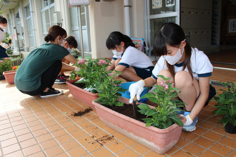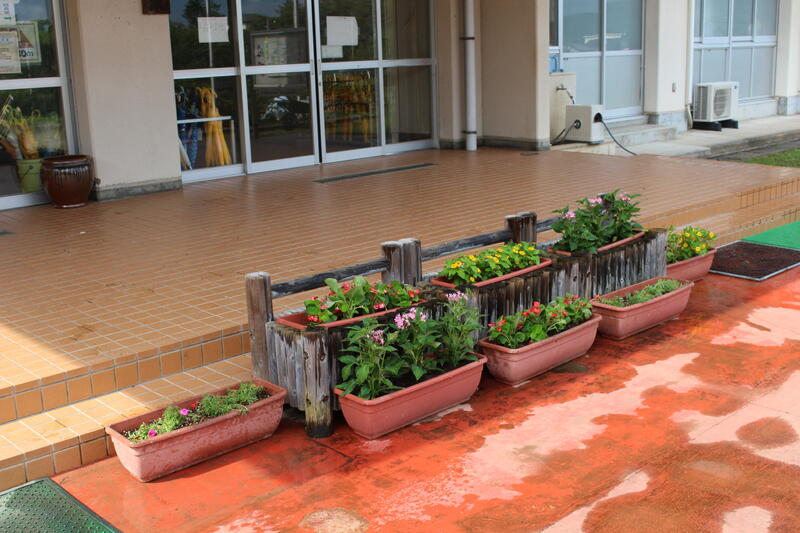 環境委員会の高野っ子が花の苗をプランターに植え、昇降口前を美しい花々で彩ってくれました。