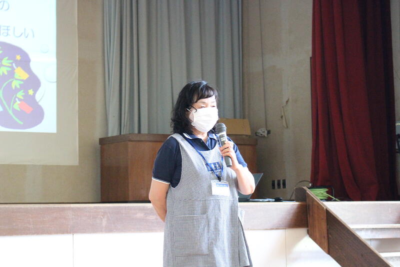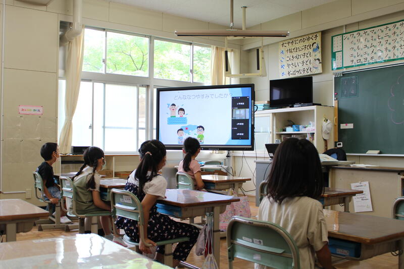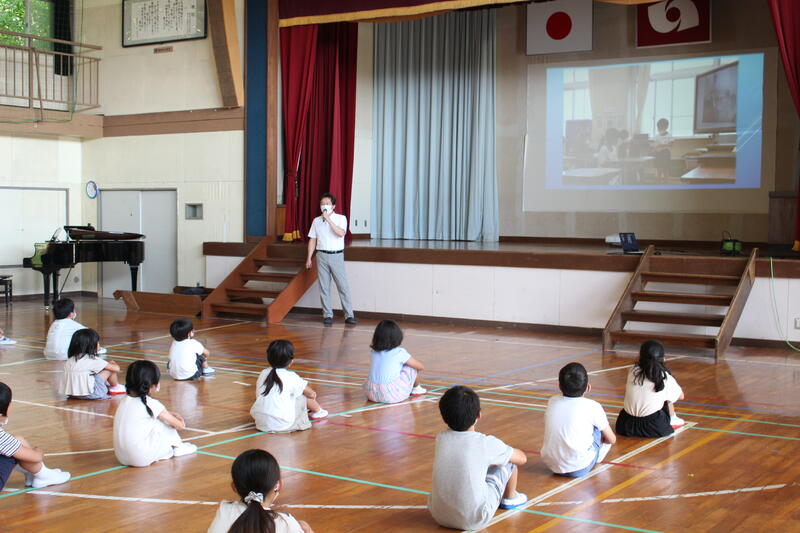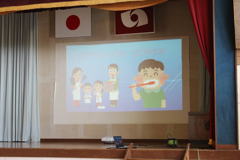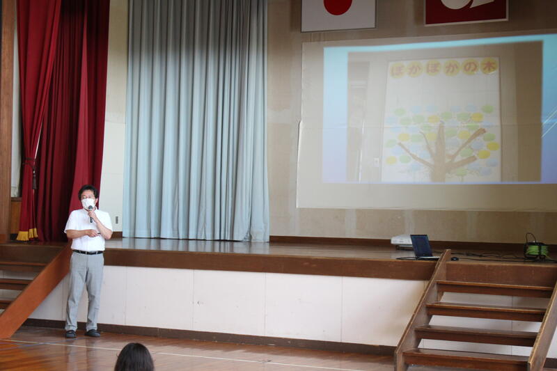 まずは校長先生から、1学期の振り返りと夏休みにがんばることについて、写真やイラストを見ながらお話を聞きました。