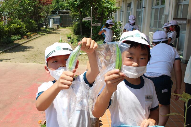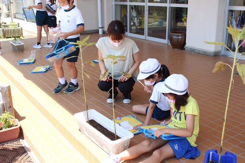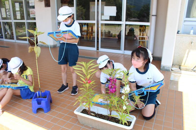 3年生は理科の学習で育ててきた植物の観察です。花が咲いたり実がなったりして、その変化に大喜び。気付いた変化を口にしながら、丁寧に観察記録をまとめていました。