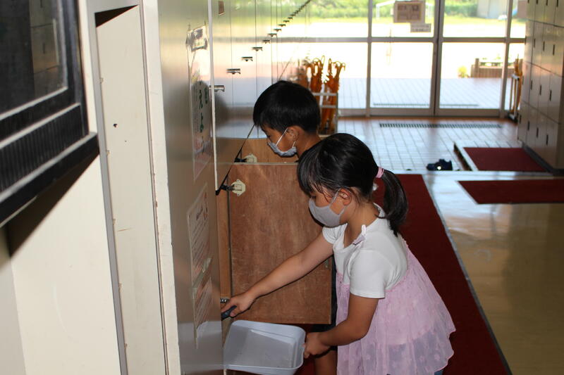 教室だけでなく、下駄箱の掃除も。働き者の1・2年生です。