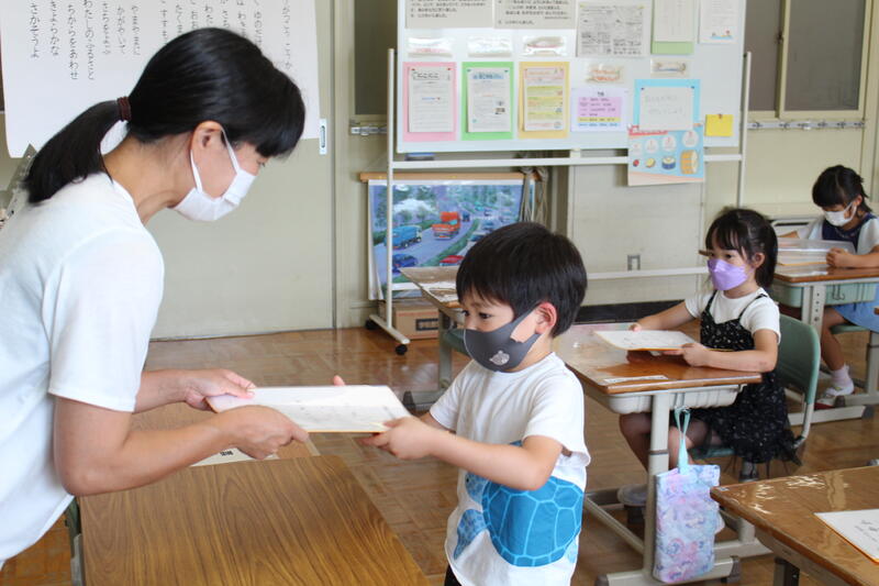1年生にとっては、初めての通知票です。担任の先生から通知票について説明してもらい、一人ずつ受け取りました。