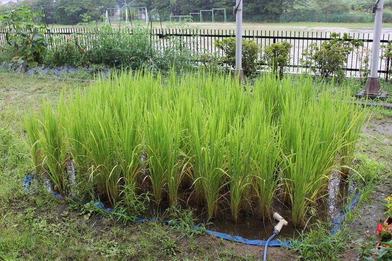 お盆も過ぎ、夏休みも残り僅かとなりました。皆様、いかがお過ごしでしょうか。夏らしくない天候の日が続いておりますが、5年生が育てている稲はすくすくと成長しています。