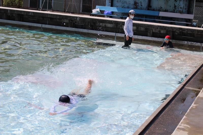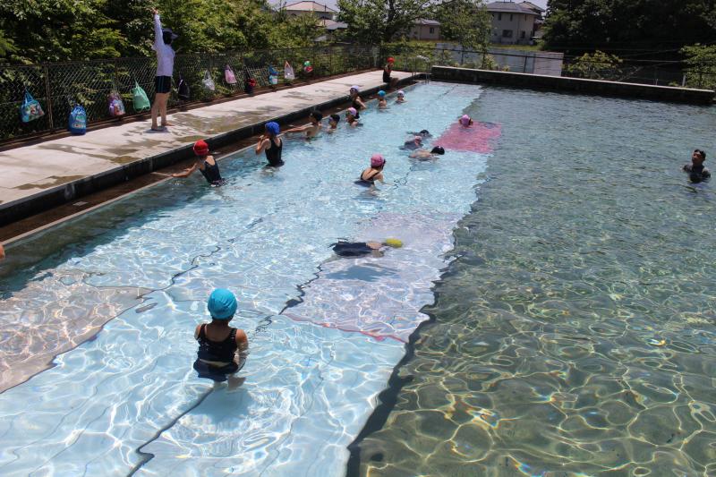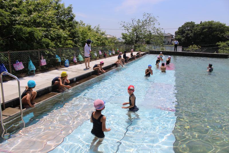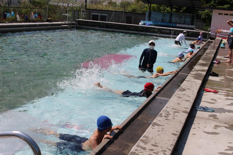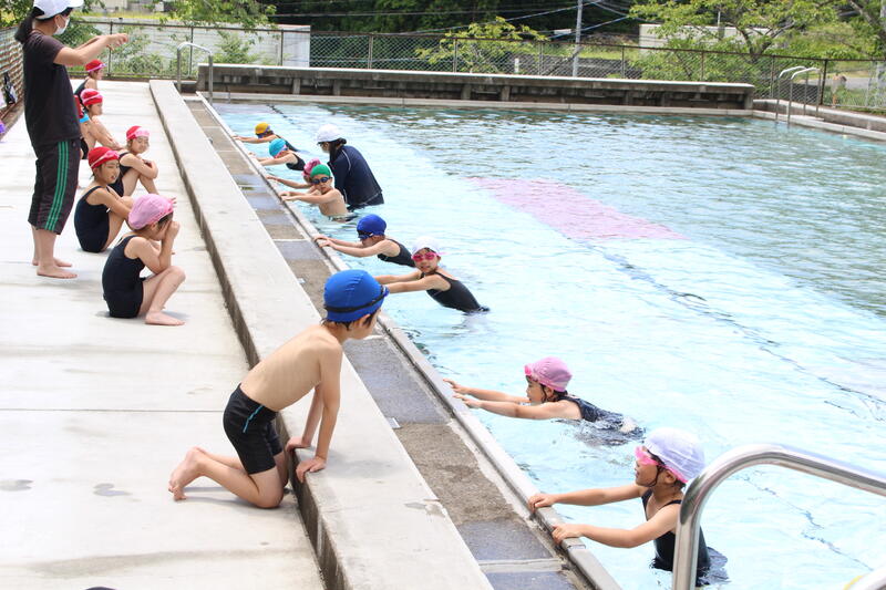 ふと見ると、プールでは水泳学習のようです。どうやら1・2年生が水泳学習に取り組んでいました。「水に顔をつけられない」と泣いてしまう人もおらず、先生の話をよく聞いて学んでいました。