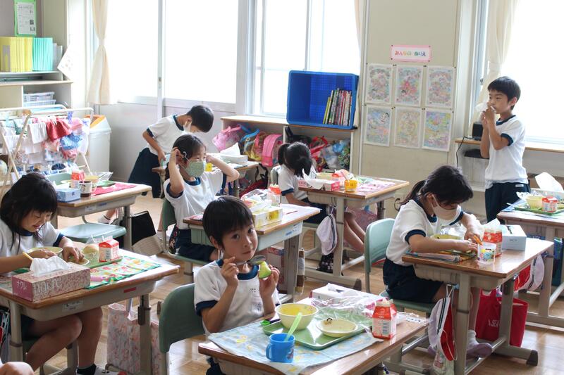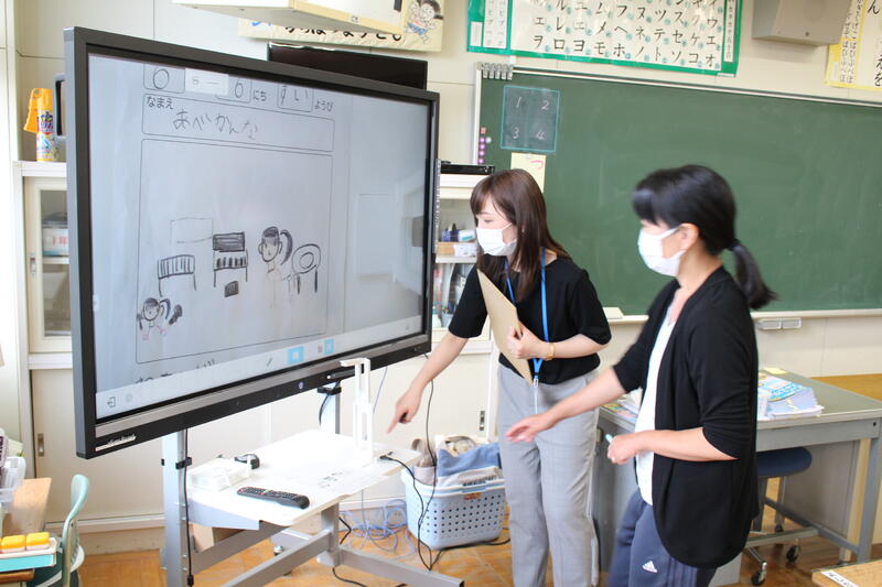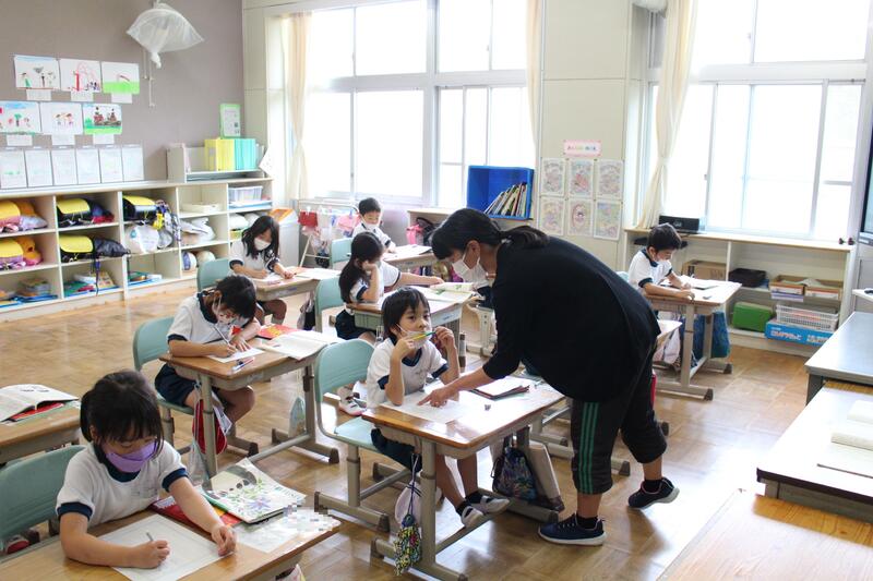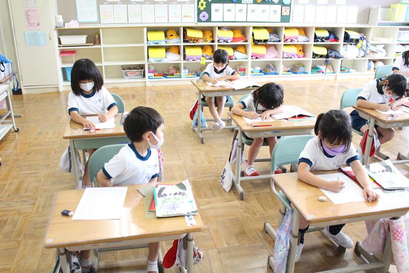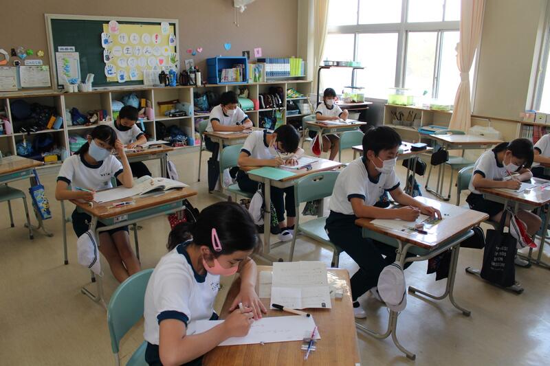1年生は国語科の学習。「自分の好きなもの紹介」の作文中。好きなものだけでなく、その理由もしっかり書いています。1学期で、だいぶ文字が書けるようになってきました。