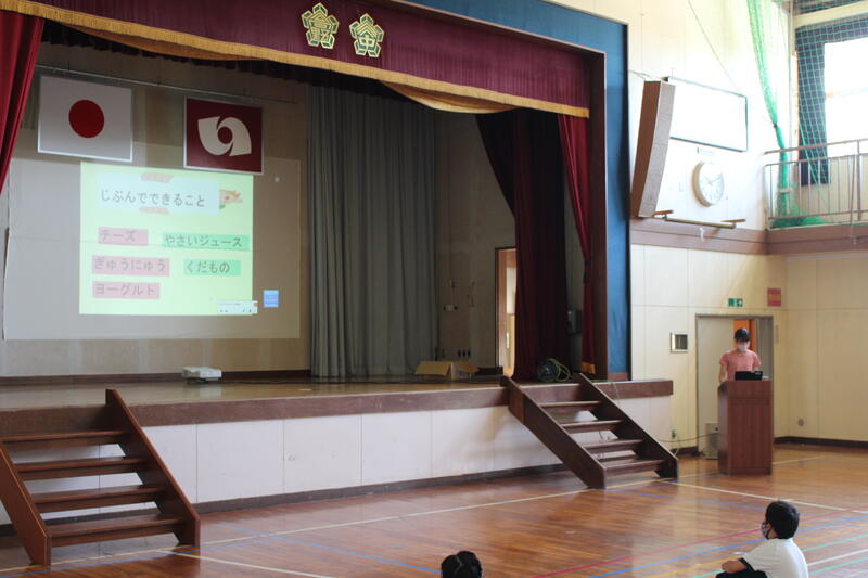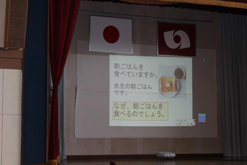大休憩には、体育館にて「すこやかタイム」が実施されました。今回は「朝ごはんを見直そう」というタイトルで、給食担当の先生からお話がありました。「なぜ、朝ごはんを食べるのか」「栄養バランスのよい朝ごはんにするために、自分ができることは」などのお話がありました。