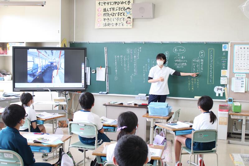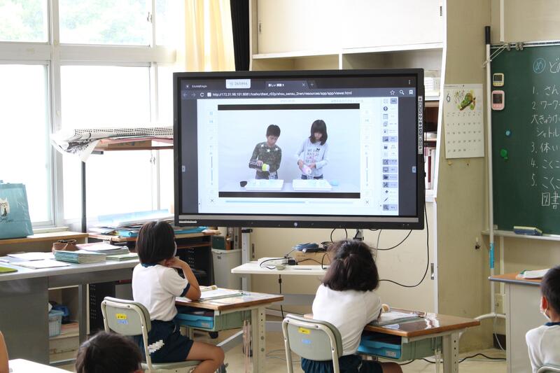 2年生は算数科の学習です。どうやら本日から「かさ」の学習になったようです。デジタル教科書を使って、どちらの水筒がコップ何杯分入っているかを考えています。分かりやすい動画なので、みんな集中して学習していました。