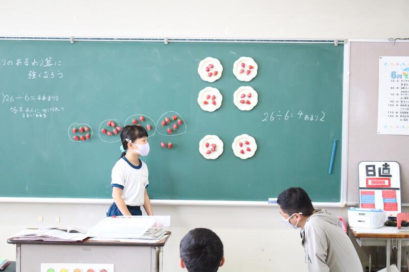 3年生も算数科の学習です。「あまりのあるわり算」の学習のようです。自分で考えたことを、みんなの前でしっかり発表できています。また、理解したことを互いに伝え合い、理解を深めていました。