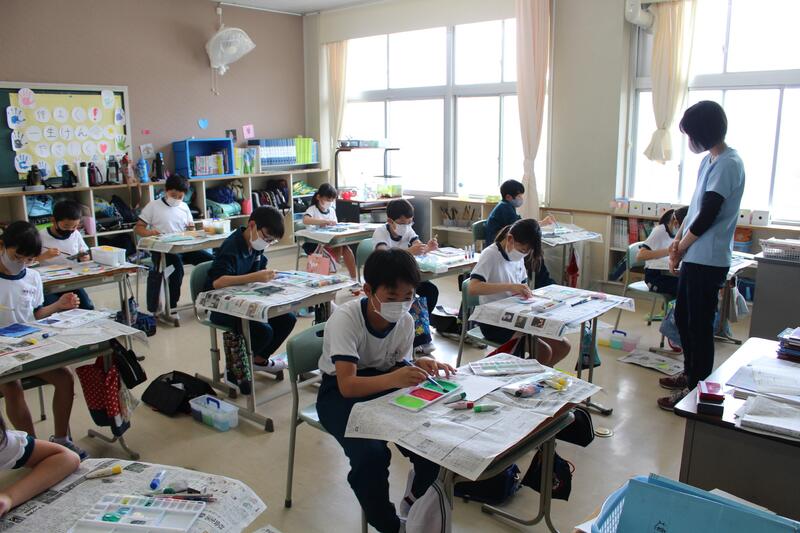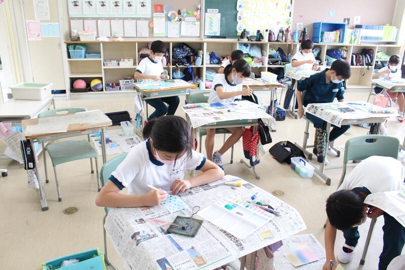 5年生は図画工作科の学習です。スパッタリングなどの技法を活用し、思い思いにデザインしています。