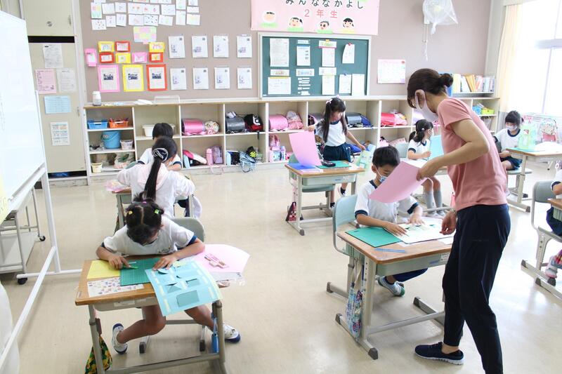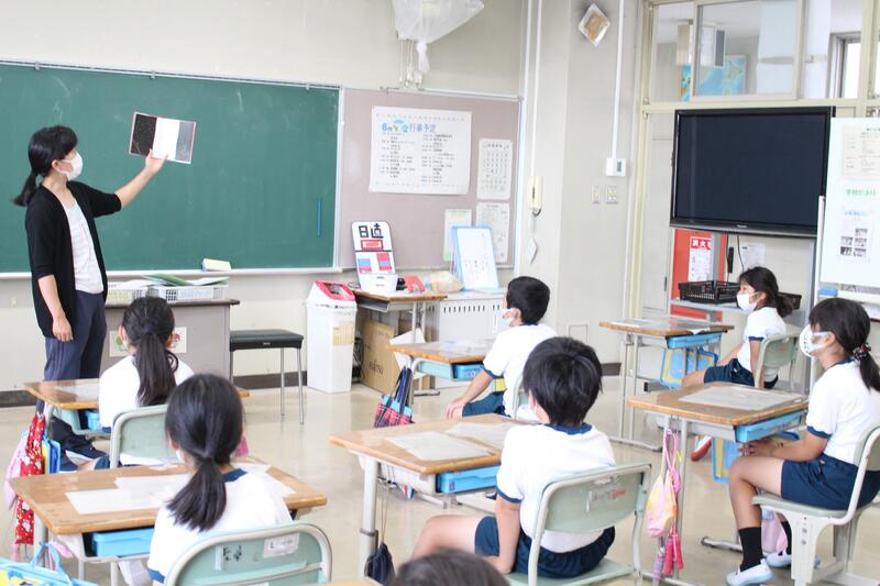 2年生は図画工作科の学習。カッターナイフを使って紙を切り抜きます。ケガをしないように、慎重に真剣に。いつも以上に引き締まった空気が流れます。