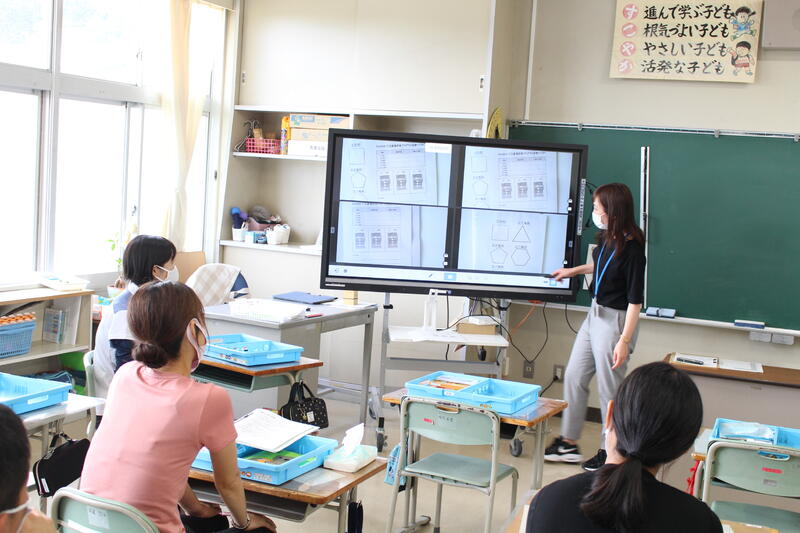 また、5校時には第5学年で算数科の授業研究会が開催されました。今年度、本校では高野っ子の算数科学力向上のためにいくつかのプロジェクトを進めています。その一つとして、内郷第三中学校の先生にも参加いただき、小中で連携して研究を進めるための授業研究会が開催されたのです。
