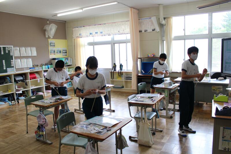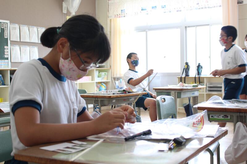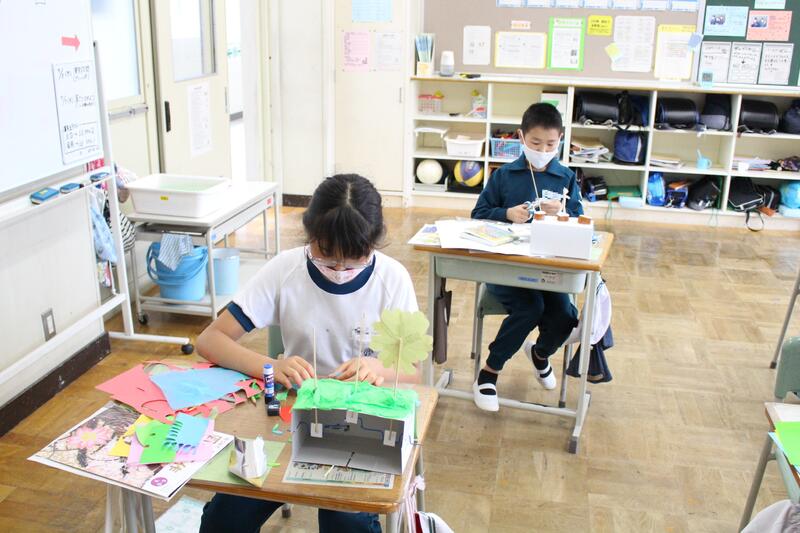 6年生は図画工作科の学習。クランクの仕組みを利用して動くものを作成中。どんな動きになるのかを想像しながら、真剣なまなざしで製作です。