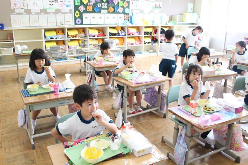 本日の給食に出た、今が旬のメロン。「はじめて食べる」とワクワクしている高野っ子も。1年生はスプーンで上手に食べられるかなと心配になり、そっとのぞくと・・・
