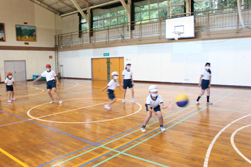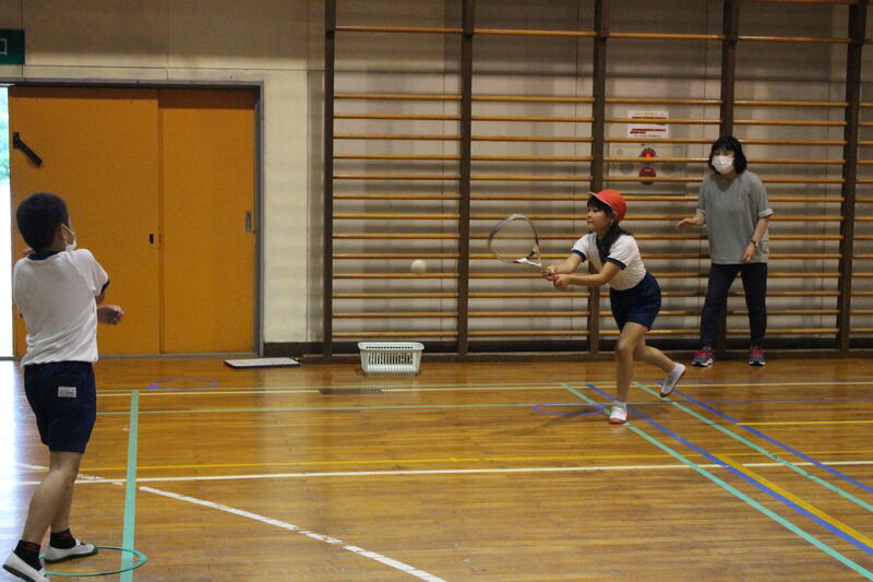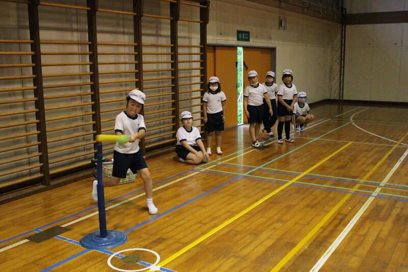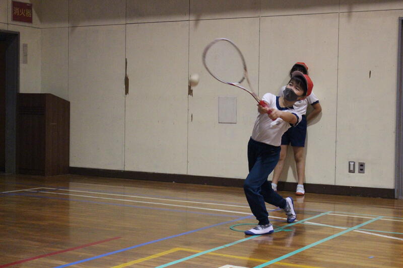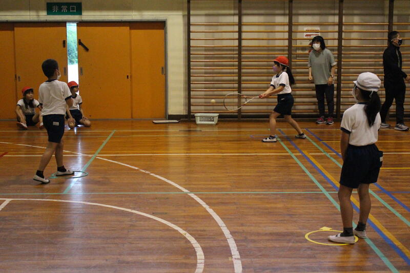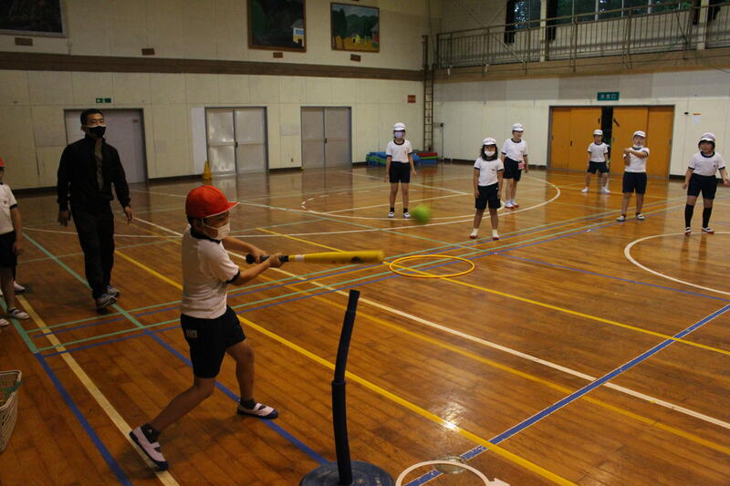 3・4年生は体育科の学習。3年生はティーボールに、そして4年生はラケットボールにチャレンジ。高学年で行うソフトボールの学習に向け、発達段階に応じた学習を展開中。見てください、この力強いスイング。ナイスバッティングです。