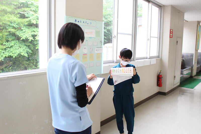 また、一人一人の学びを見取り、次の指導にいかすため、先生と一対一での英語での会話も行われていました。先生の質問に英語で答える5年生。立派です。