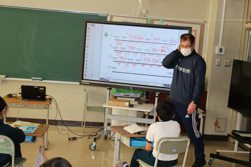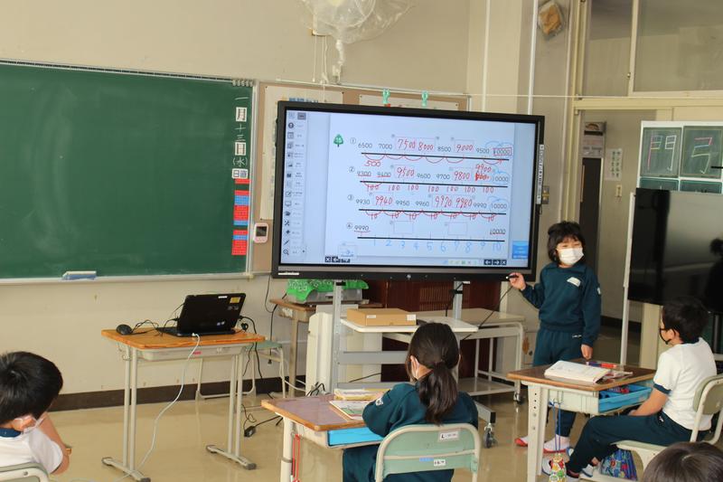 2年生は算数科の学習です。1000より大きな数の順序について学んでいます。数直線を読み、考え、それを電子黒板を使って学級のみんなに説明する姿が見られました。ここにも、成長を感じるワンシーンがありました。