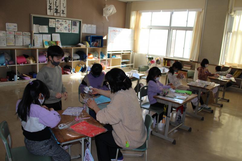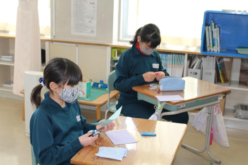 3年生の教室では、図画工作科の学習が行われていました。ゴムの力で動くものの制作のようです。子供たちは、材料からイメージを膨らませて、楽しそうに制作していました。