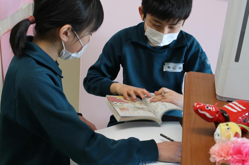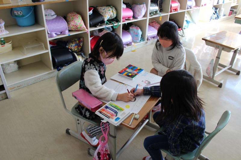 2年生の教室では、学級活動が行われていました。みんなで決めた係の活動内容を、メンバー全員で話合ってまとめています。「ここに、順番も書いた方がいいよ」などとアイデアを出し合いながら、協力し合って作成していました。