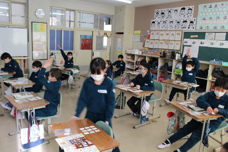 6年生の教室では、外国語科の学習が行われていました。「寺」や「美術館」などの施設が英語で何というかを、ゲームを通して学んでいました。みんなとっても楽しそうでした。