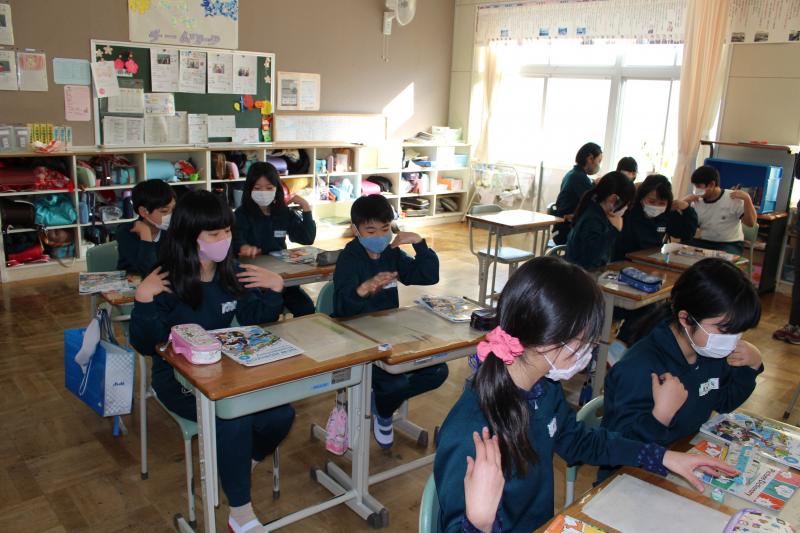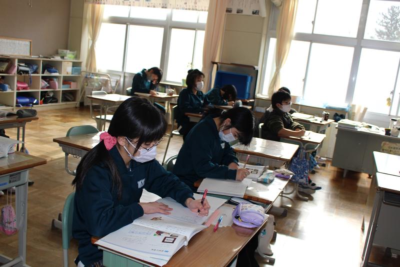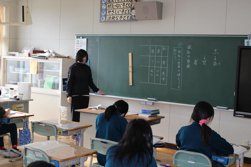 6年生は国語科の学習です。仮名の由来や特徴について学んでいました。卒業が近づいているためか、落ち着いてしっかりと学習に取り組む6年生でした。