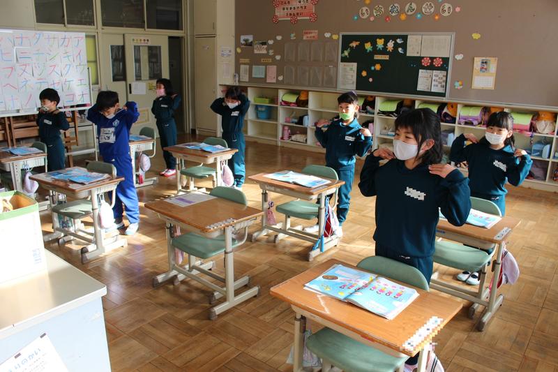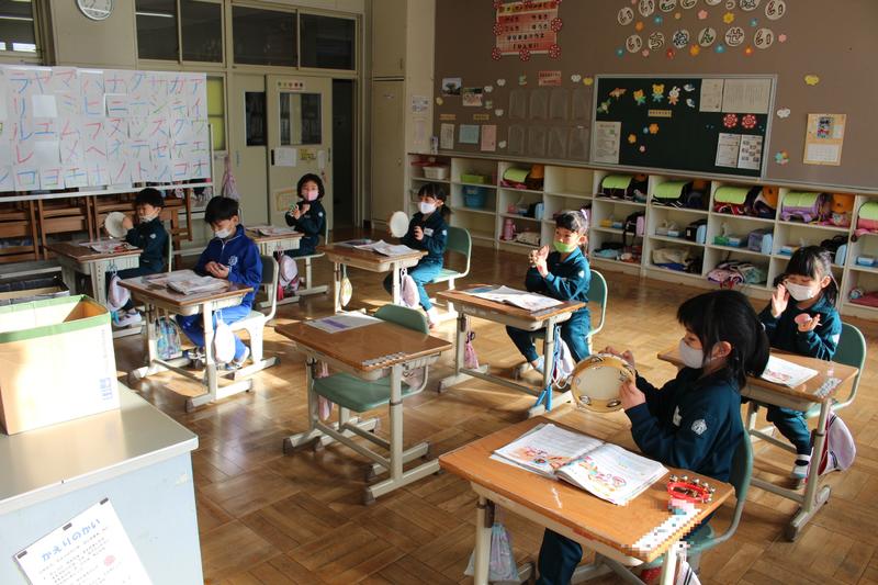 1年生は音楽科の学習です。マスクをしたまま小さな声で歌ったり、身体を動かしたりして学んでいました。