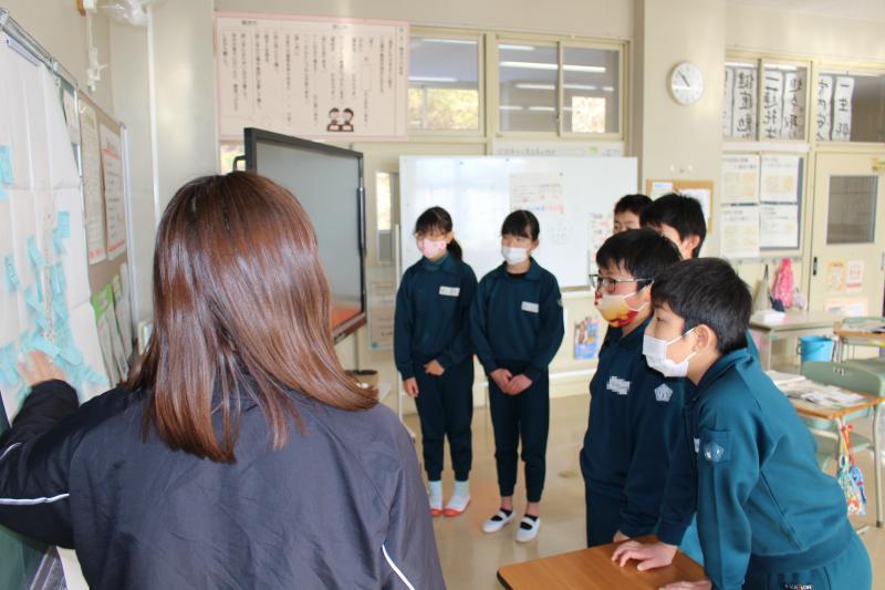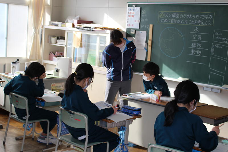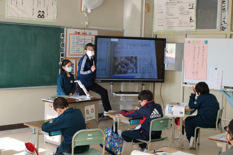 4年生は理科の学習です。寒くなってからの生き物の様子を観察し、それを発表し合っています。