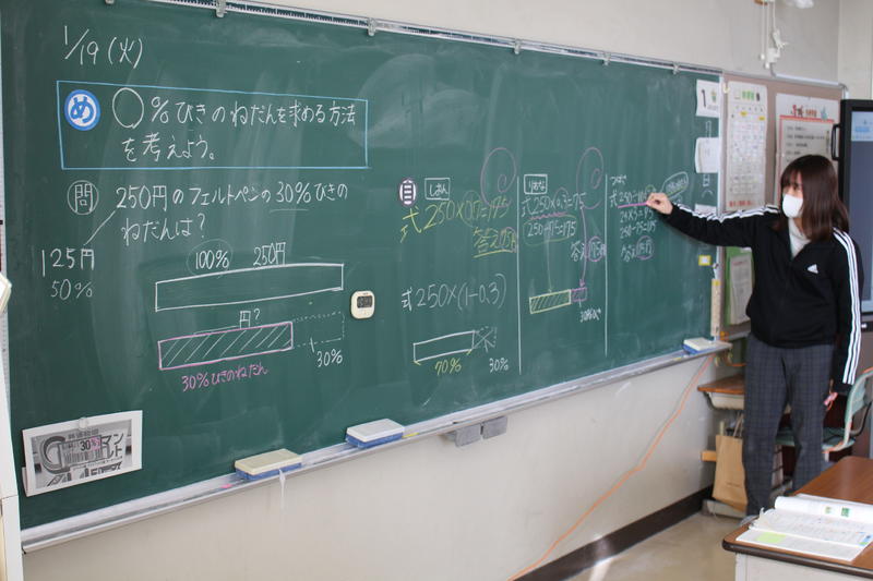 5年生は算数科の学習です。「割合」の学習で3割引の値段を求めているようです。5年生の子供たちはよく考え、その方法を互いに伝えながら学習していました。また、友達の考え方をよく理解し、「つまり、こういうことでしょ」などと要約して説明することもできていました。