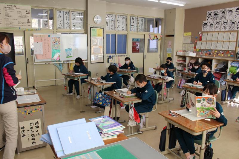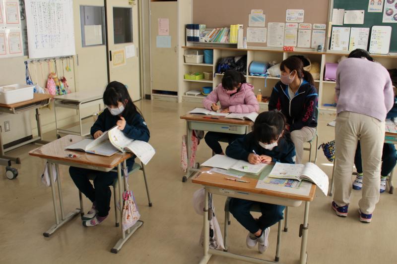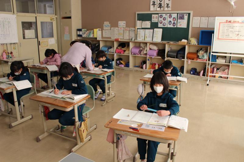3年生は算数科の学習です。本日は単元のまとめの学習のようで、練習問題や発展問題に取り組んでいました。子供たちの進度に合わせて指導ができるよう、先生も複数での指導でした。得意な人はどんどん学習し、ちょっと苦手な人は教えていただきながらじっくりと学習していました。