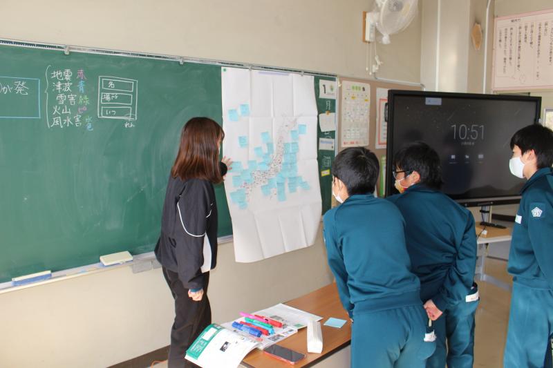 5年生は社会科の学習です。国内で発生した自然災害を調べ、それを白地図にまとめ、その特徴を考えていました。