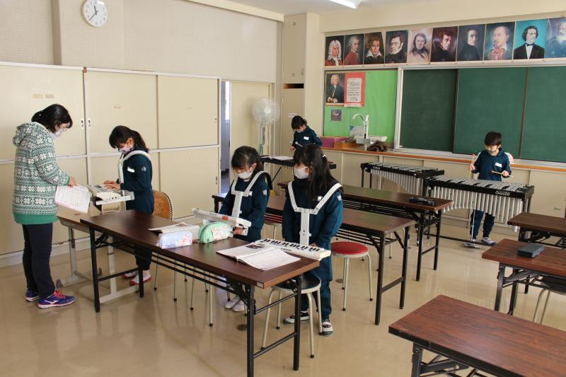 3年生は音楽で「聖者の行進」の演奏です。木琴、鉄琴、鍵盤楽器に分かれて練習しています。「心をひとつに」がんばっていました。