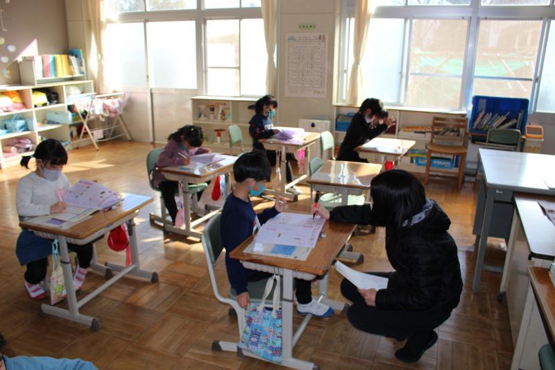 1年生の教室では、国語の学習が行われていました。見て見ますと、助数詞の問題です。大人は生活の中で何気なく使っていますが、1年生にとっては「?」になる問題です。これまでの経験を振り返りながら、一生懸命に考えていました。