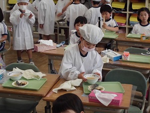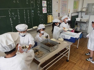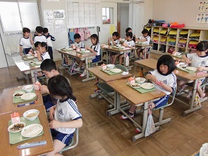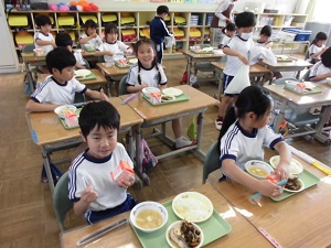 ところで、運動会が終わり来週からは家庭訪問が始まります。1年生はこの運動会が終わったころから、学校生活に慣れて落ち着きさが見られます。今日の給食の準備です。自分たちで上手に配膳できました。成長の跡が感じられます。