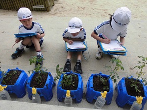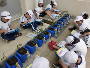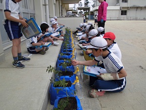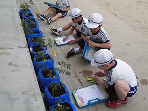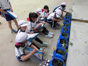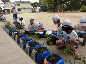 2年生の生活科でミニトマト栽培の学習です。自分たちで苗を植えて水をかけて観察しました。これからどんどん大きくなるように、おいしいミニトマトができるように毎日お世話をしてもらいたいです。