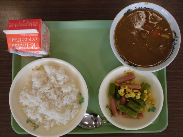 本日の給食メニューです。子どもたちの人気ナンバー1カレーです。