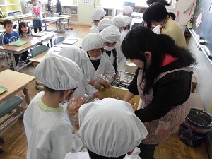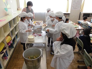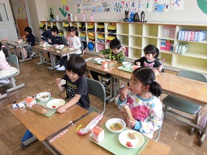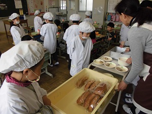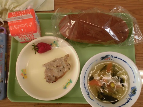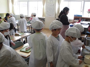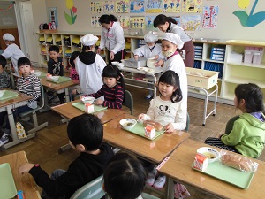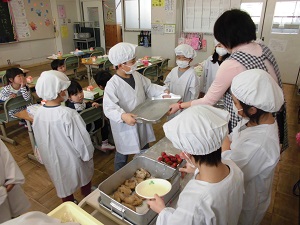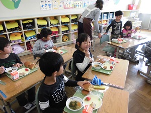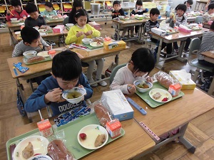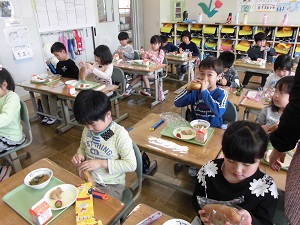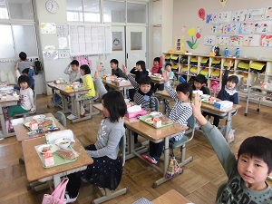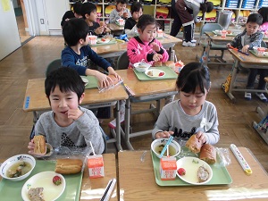 学校生活の中でもみんなで食べる給食の時間は楽しみです。今日から給食が開始しました。1年の先生方が配膳の仕方、食べ方、後片付け等の事前指導を丁寧に行ってから、給食当番さんのお手伝いをえながらおいしくいただきました。
