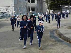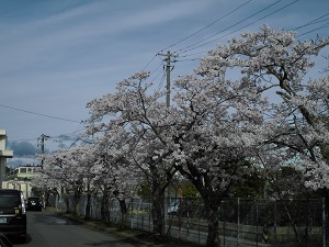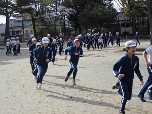 校地内の桜の花が満開のもとで、体力増強にとトレーニングしています。