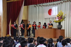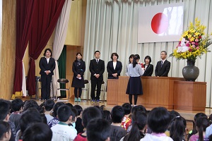 この4月に12名の新しい教職員が着任したので、子どもたちに披露しました。