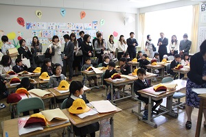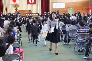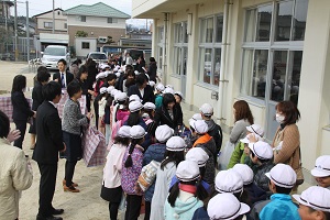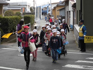 今日から集団登校で歩いてきた1年生。班長さんに付き添われて登校してきました。